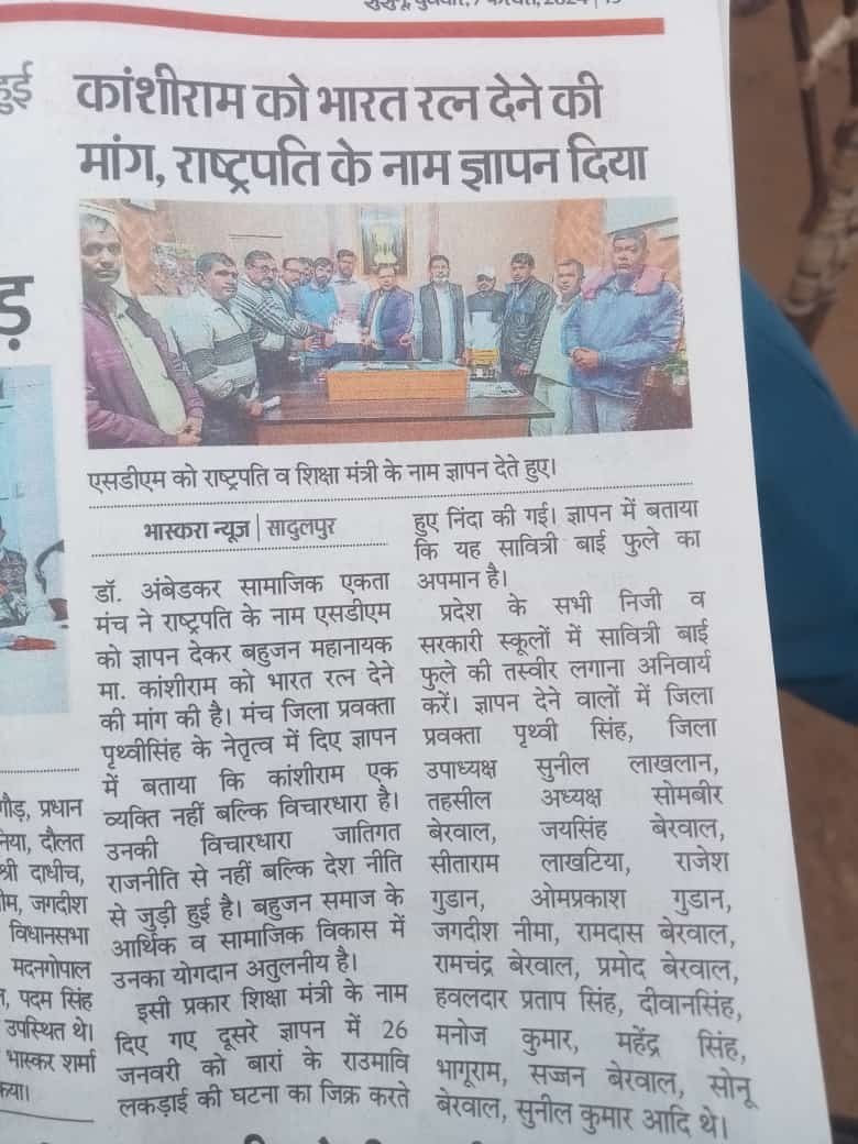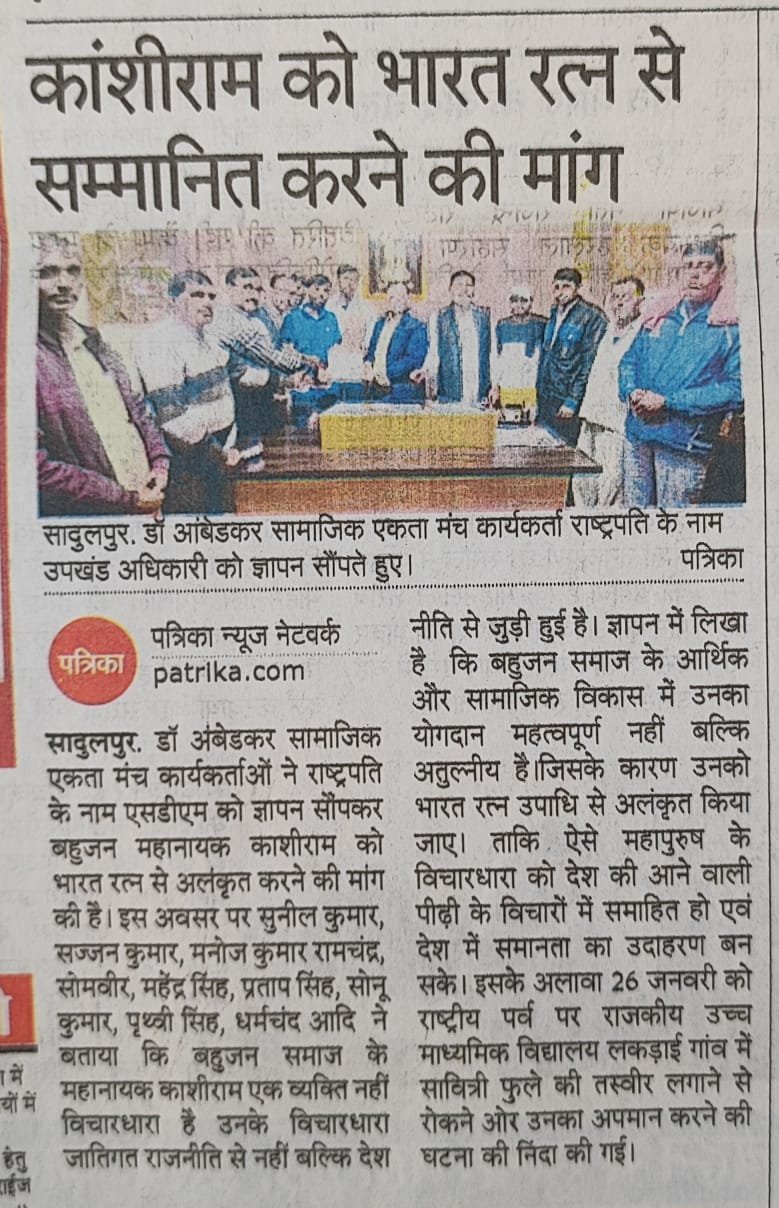 साथियों जैसा कि आप जानते हैं की संगठन की ताकत एक बड़ी ताकत है पर कुछ तथाकथित नेता जातिगत संगठन बनाकर अकेले नेतागिरी का झंडा तान रहे हैं जबकि डॉ.अंबेडकर सामाजिक एकता मंच समस्त समाज को साथ लेकर संगठन को मजबूत करने का काम कर रहा है व बहुसंख्यक समाज को संगठित करने के लिए प्रयासरत है डॉ. अंबेडकर सामाजिक एकता मंच निरंतर काम इसलिए कर रहा है कि हमारे साधे हुए लक्ष्य पर सफलता मिले, यदि किसी कारणवश हम असफल भी हुए तो हमें कोई शिकवा नहीं होगा। हमें कम से कम यह संतोष तो रहेगा कि हमने कोशिश तो की, इसलिए हमें बाबा साहब के मिशन को पूरा करने के लिए अपनी जिंदगी का एक बड़ा हिस्सा खर्च करना होगा। क्योंकि मेहनत और ईमानदारी से काम करने वालों की कोशिश एक दिन जरूर रंग लाती है इसलिए साथियों मेरी आप सभी से अपील है की सभी साथी तन, मन, धन से लगकर भीम कारवां को आगे बढ़ाने का काम करें।